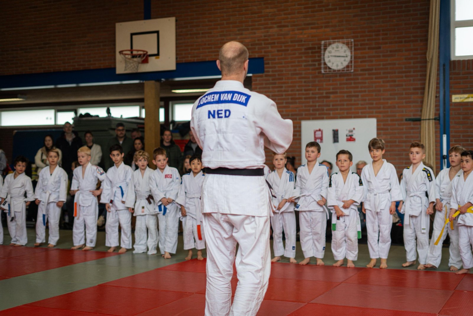 Toernooidirecteur ;) Jochem van Dijk leidde de centrale warming-up en zorgde voor de strakke aansturing van het hele team. Hierdoor verliep de dag vlekkeloos en heerste er een fantastische sfeer in de dojo.